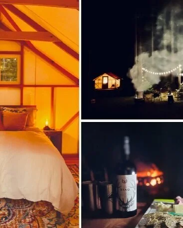 A lovingly restored farmhouse serves as a central base, while the surrounding acreage offers numerous options to gather for festivities + celebrations. Our private site includes eight luxe cabins and BYO camping areas along with a beautiful bath house and exquisite outdoor redwood tree shower providing a unique and very special experience for your event.